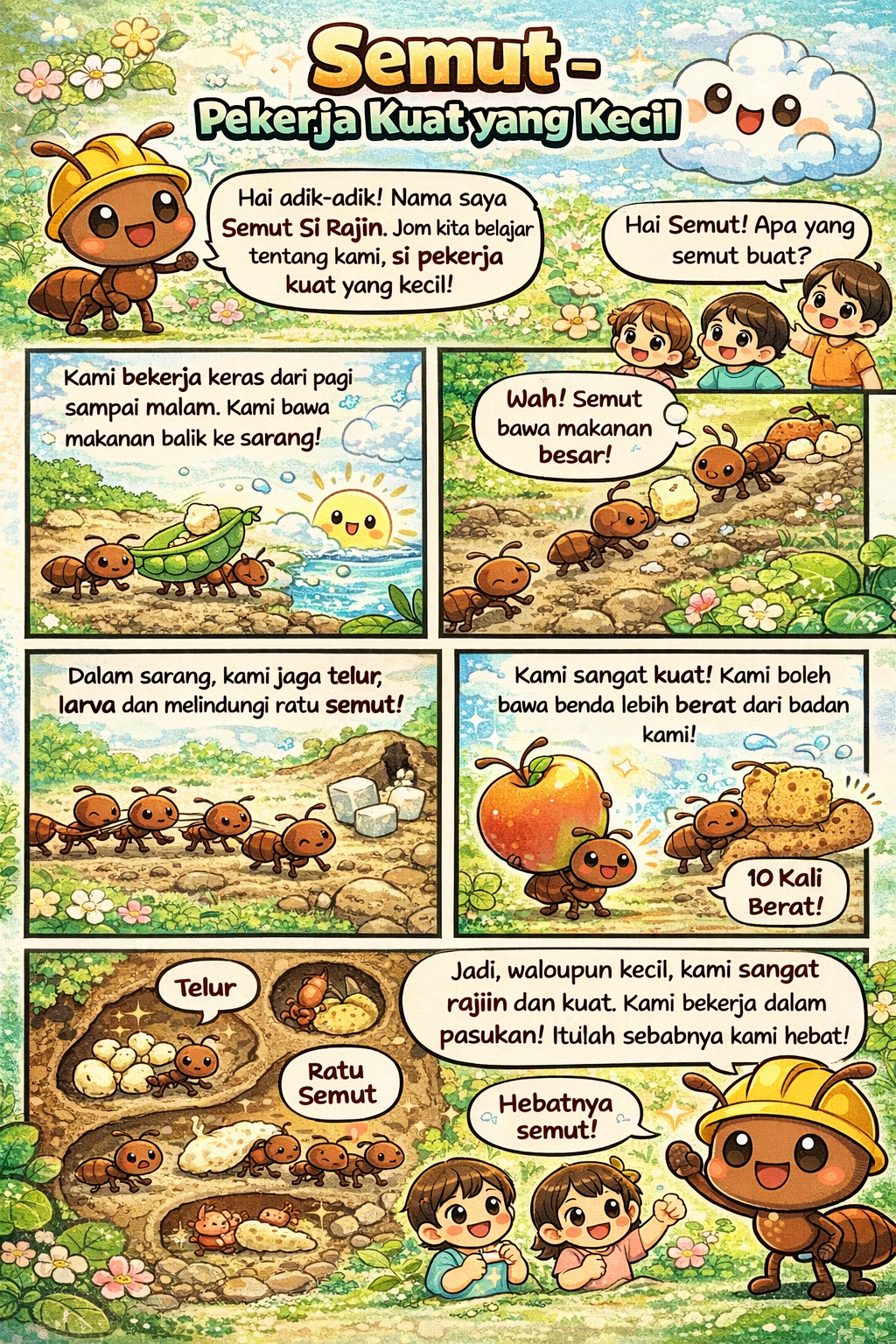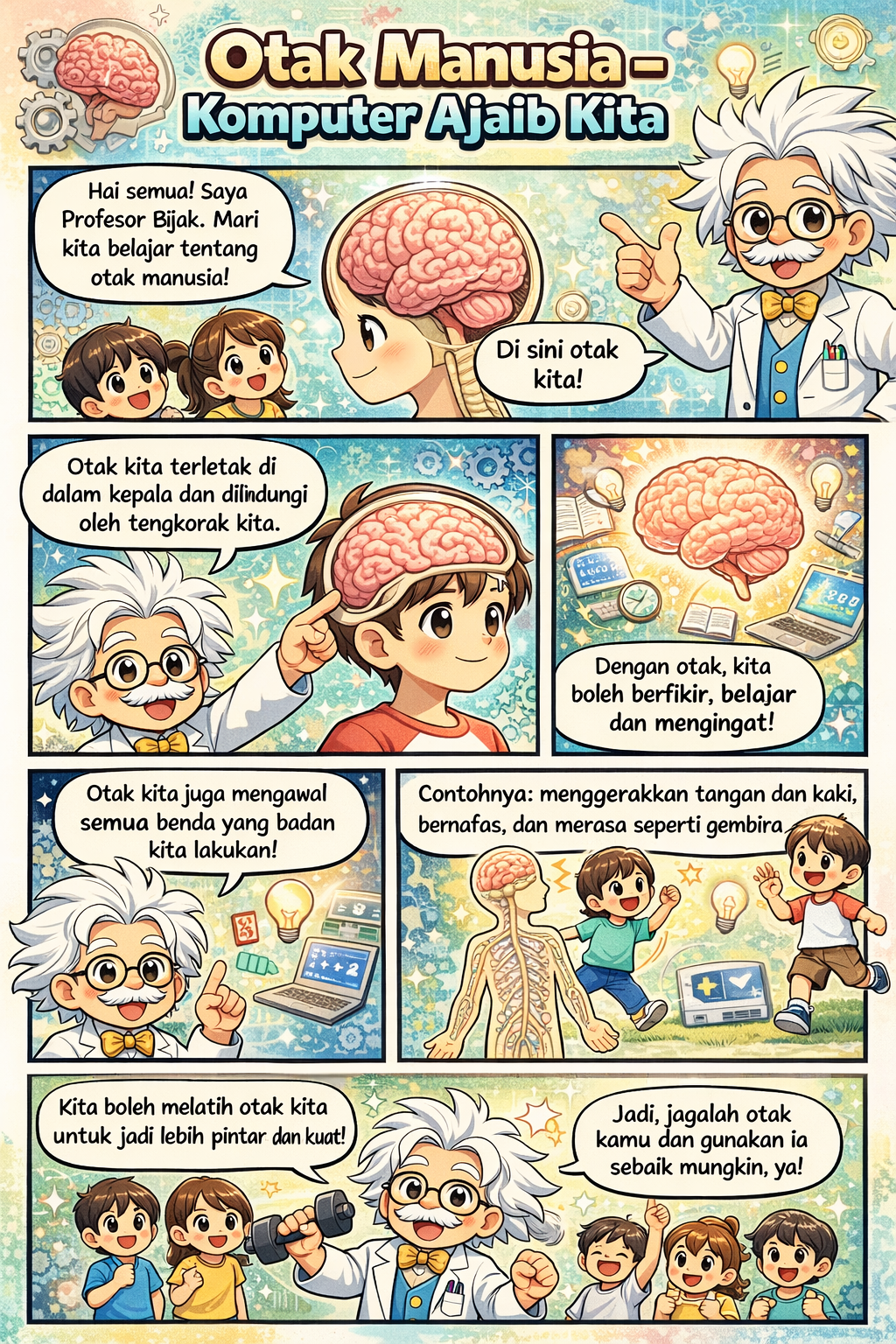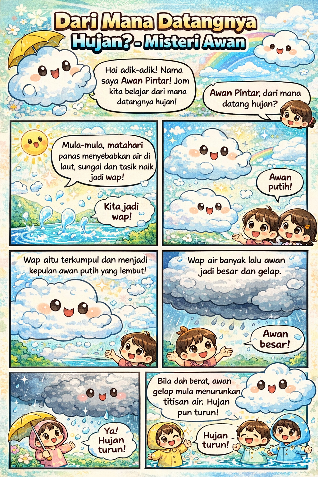 Untuk hasil terbaik, gunakan topik yang spesifik dan sesuai dengan umur sasaran. AI akan menghasilkan komik yang lebih menarik dan mudah difahami!