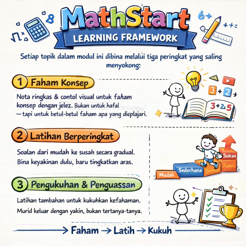 Jika anda mencari bahan yang sudah “siap masak”, Wasza MathStart adalah jawapannya. Dibina melalui ujikaji bersama Guru Cemerlang, ia menggunakan framework Faham → Latih → Kukuh.